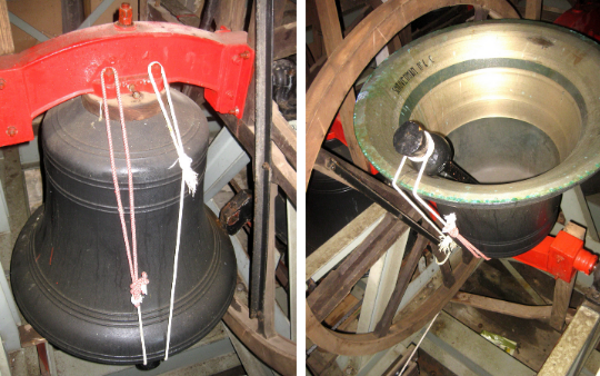 Reach under the bell and pull the loose end of rope fairly taut against the middle of the far side of the lip of the bell. Then tie a clove-hitch around the narrow part of the flight as shown. With practice you can make the knot and then slip it over the flight. Adjust if necessary so that the clapper is about in the middle of the bell and pull tight.